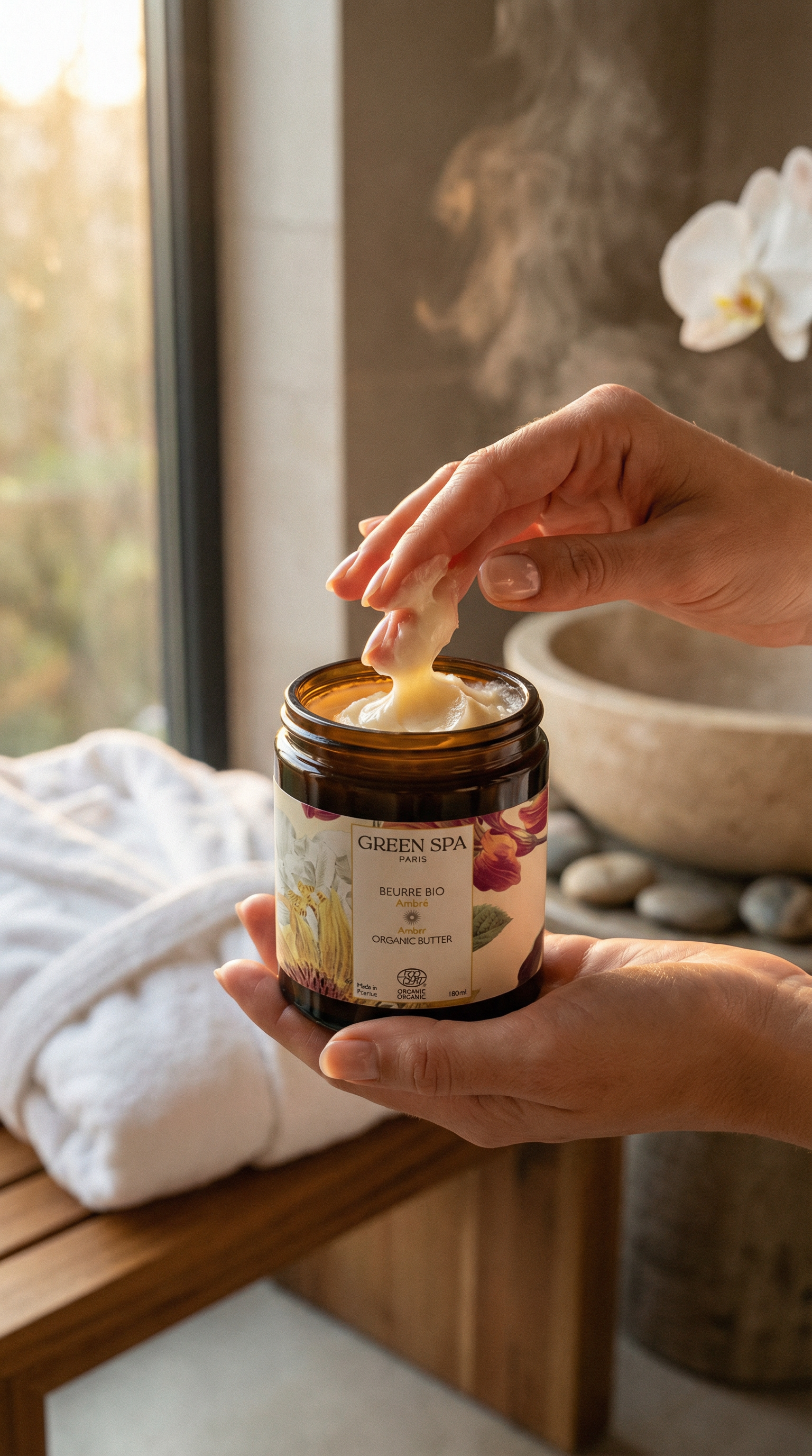 Le beurre Ambré, c’est aussi un beurre biologique qui repose sur une composition naturelle : huile de coco bio, beurre de karité bio, cire de carnauba bio… Tant d’ingrédients qui lui donnent sa texture unique.