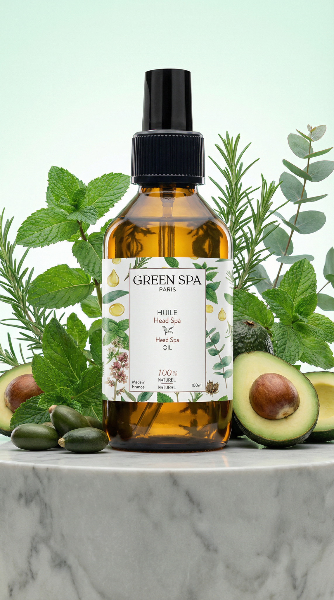 Formulée et fabriquée en France, l’Huile Head Spa de Green Spa associe des ingrédients naturels reconnus pour leurs bienfaits sur le cuir chevelu. L’huile de ricin bio et l’huile d’avocat nourrissent intensément, renforcent la fibre capillaire et soutiennent la pousse, tandis que les huiles essentielles de romarin camphré, d’eucalyptus et de menthe poivrée purifient, stimulent et rééquilibrent le cuir chevelu.