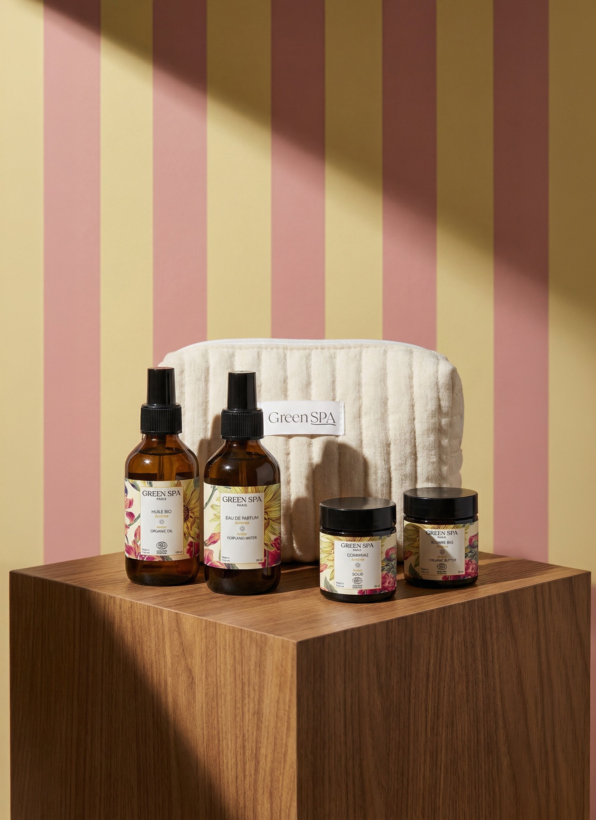 La Trousse de Voyage Sensorielle Green Spa est née de cette idée : vous offrir la liberté de prolonger l’expérience du soin, où que vous soyez.