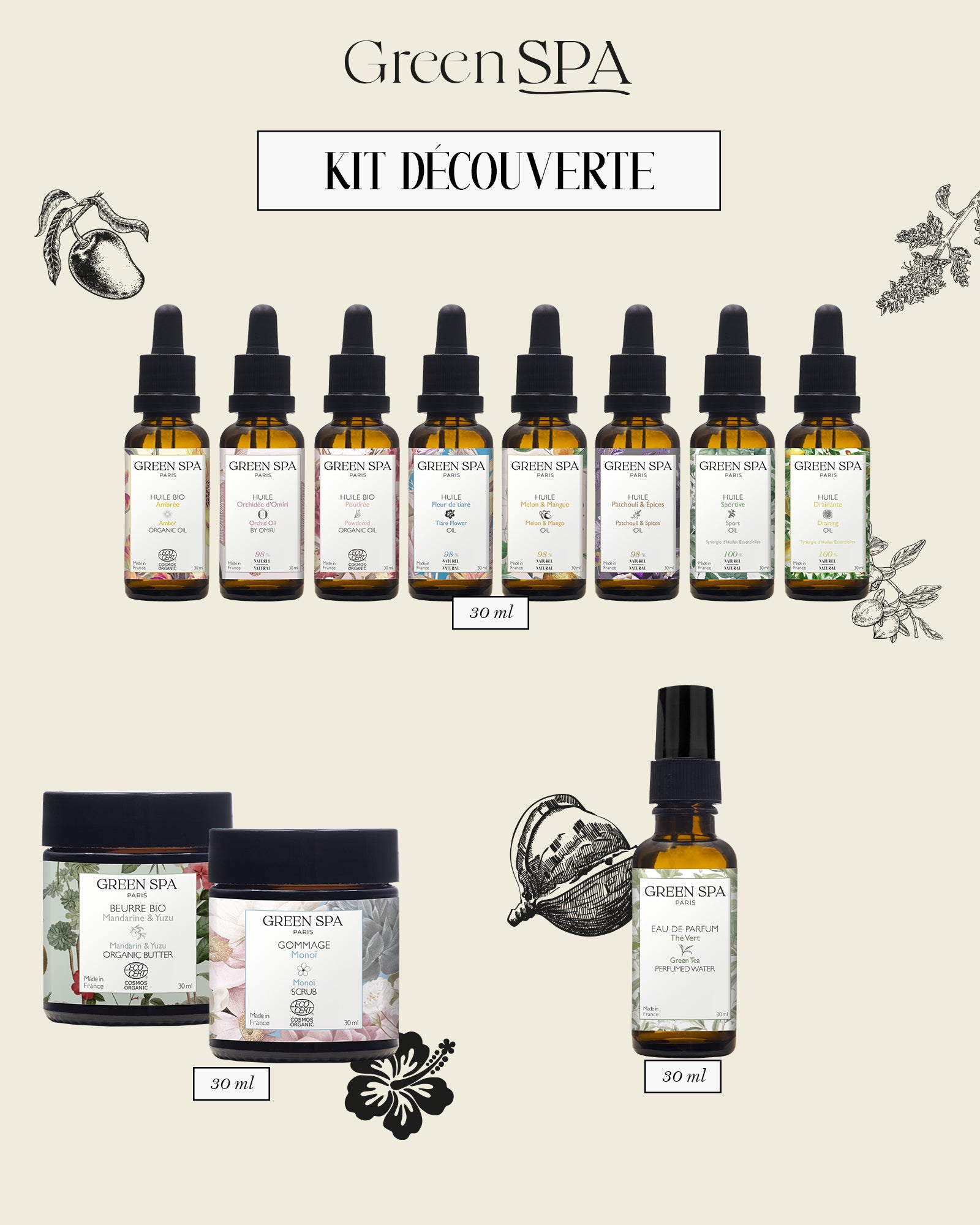 • 8 Óleos (30 ml cada) : Aromas de âmbar, flor de tiare, pó, orquídea por omiri, patchouli & epices, melão e manga, drenagem e esportiva.